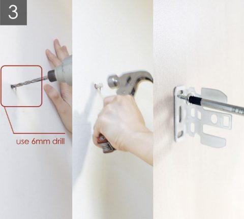 ③ Drill as the reference position marks. Nail plastic nylon anchors into the wall and secure the mounting brackets tightly.